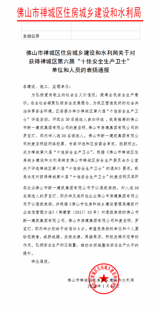 近日,佛山市禪城區(qū)住房城鄉(xiāng)建設(shè)和水利局(以下簡(jiǎn)稱(chēng)“區(qū)住建局”)下發(fā)《關(guān)于對(duì)獲得禪城區(qū)第六屆“十佳安全生產(chǎn)衛(wèi)士”單位和人員的表?yè)P(yáng)通報(bào)》,因我司總工程師麥啟明獲評(píng)禪城區(qū)第六屆“十佳安全生產(chǎn)衛(wèi)士”,區(qū)住建局由此對(duì)我司及麥啟明個(gè)人進(jìn)行通報(bào)表?yè)P(yáng),并分別給予誠(chéng)信加分5分。